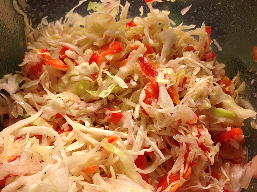 Slice cabbage, red onion, and pepper using a mandolin. I have it set to the straight blade at 1/8th inch, but other blade options will vary things up–experiment and let me know how it goes.