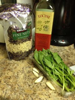 2. Blend the olive oil, pine nuts, garlic, basil and a pinch of salt in a