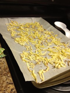3. Spread out the shredded white sweet potato on a baking sheet. Bake in the over for about 20 to 25 minutes, or until at least some are crispy.