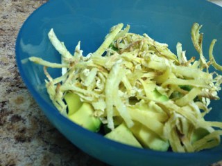 6. Gently mix the avocado, shredded sweet potato and pesto together in a medium bowl.