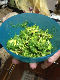 So, instead, we nixed a one or two other planned meals and made the chickens. Tuesday night, after dinner, I set to making homemade pesto for our first roast chicken. Brent or I (honestly, I don’t remember who’s idea it was) thought stuffing the chicken with pesto would be more interesting that the standard lemon and garlic roast chicken. In addition, to try adding texture and substance, we agreed we’d crisp up some of the shredded white sweet potato (seriously, we had a lot of this stuff–it’s gone into a ton of recipes lately!) and add that plus some avocado to the chicken cavity.