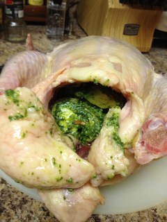 7. Using a big spoon, ladle or your hands to scoop the pesto mixture into the cavity of the chicken.