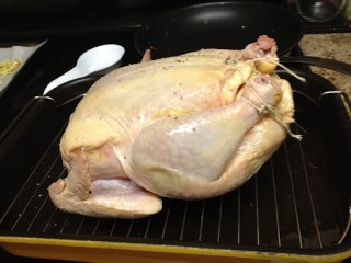 Meanwhile, prepare the chicken: remove any gizzards and other internal business, rinse it under cold water, and pat dry with a paper towel. Place on the rack in your roasting pan.