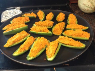 These were very hot, I think in large part due to the fact that Whole Foods only had gigantic jalapeños. Smaller sized peppers would definitely help.  Also try this mixture in mushroom caps or non-spicy peppers.  It is a great flavor finger food that’s also pretty filling.  We hope you enjoy!