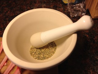 Combine all ingredients into your mortar and pestle and grind to a medium-fine consistency.