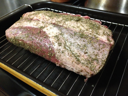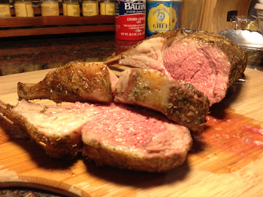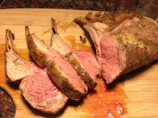 Once the oven is preheated, place lamb in the oven (fat side up) for 8 minutes. The top should be slightly browned at this point. Then, lower the oven temperature to 350ºF and cook for approximately 20 minutes. Keep an eye on the lamb’s internal temperature using a meat thermometer, and adjust the time to suit your preferences: an internal temperature of 120ºF will result in a rare cooking and 140ºF medium. We took the lamb out after 21 minutes with an internal temperature of 130ºF, which was medium rare.