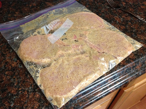 While the planks soaked in the sink, we placed the pork chops in a bag with the mustard to marinate. We probably used 2-3 tablespoons, but feel free to add/subtract to your liking of mustard. We cooked the chops at 350ºF, so if you’d also like to preheat your oven now, that’s not a bad thing.