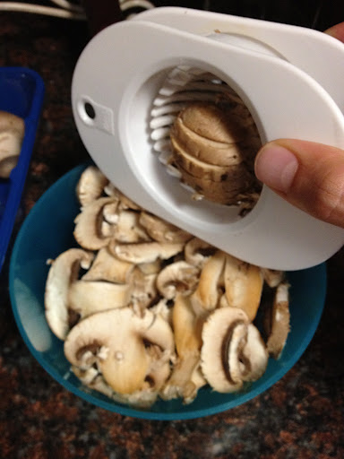 If you don’t already have an egg slicer, do get one. I’m pretty sure I got mine at the dollar store. They’re great for the obvious slicing of eggs for salads and the like, but also amazing for mushrooms, as you can see. More uniform cuts, less fuss, less muss. Ok. Informercial done.