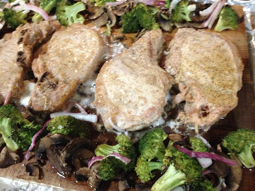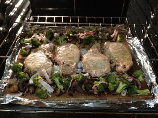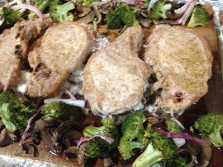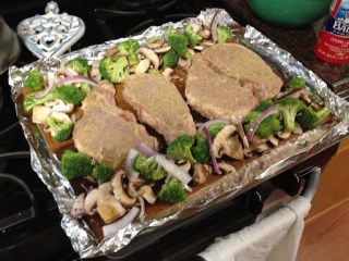 Once your oven is ready to go, place the planks in a baking dish (or create a pseudo-baking dish with foil on a cookie sheet), and add on the chops and assorted vegetables. We then drizzled the vegetables with olive oil and sprinkled some sea salt.
