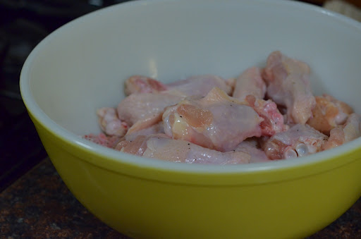 Add your dutch oven with coconut oil to the oven so that it may heat up with the oven. Rinse and lightly salt and pepper chicken while you wait for the preheat to finish.