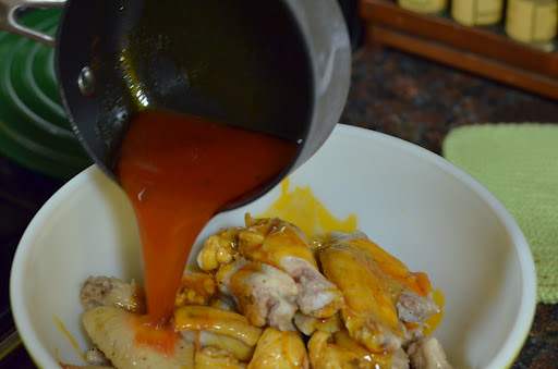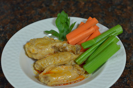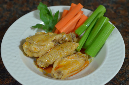Once you have finished cooking the wings (ours took 4 batches), pour your dill/buffalo hot sauce over the wings and allow to sit. Prepare your traditional sides, like carrots and celery, and then serve.