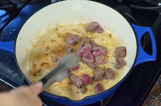After melting coconut oil in skillet on medium-high heat, quickly sear stew meat.  This will happen quicker than you expect, so keep a close an eye on it.  Place meat aside, and then quickly brown the thinly sliced onion and set aside with the meat.