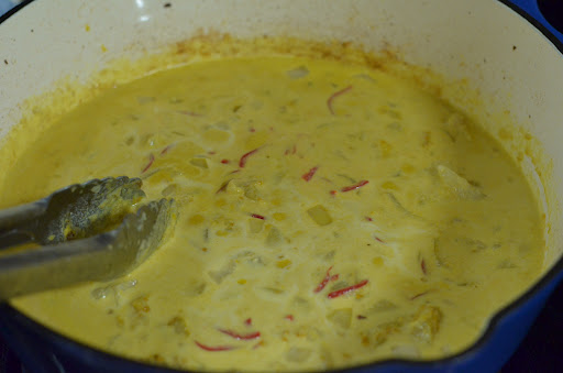 Next add in chili and tumeric to sauté quickly (no more than a minute) and then add coconut milk and coconut aminos.