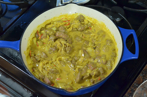 Serve up and enjoy!  While not terribly spicy (next time I plan to double the red chili), this was a hearty meal with flavors unlike our traditional fare.  The change of pace was definitely welcome.  We’ll have to do more of this in the future.  Enjoy! We had this over a bed of cauliflower rice, but there’s no reason you couldn’t have it on its own.