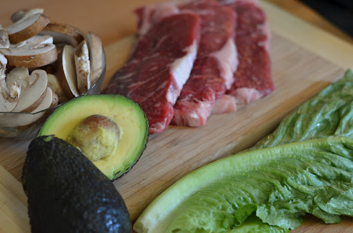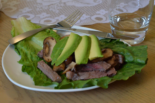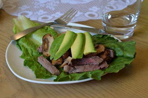 Slice steak into thin strips, and place steak and mushroom, with sliced avocado, into a romaine lettuce leaf. Enjoy!