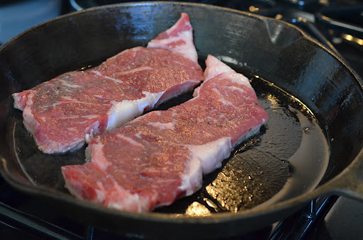 Heat olive oil in your cast iron skillet on a medium-high heat and sear steaks (seasoned with salt and pepper) for 3-4 minutes per side.