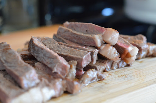 While visiting my parents in Virginia and taking advantage of the farmer’s market in their town, we needed to do something for lunch. My parents are supportive of our eating habits, but haven’t decided it’s time for them to take on the same dietary approach. Growing up in the midwest, I can totally appreciate that after 50+ years of eating a certain way without any pressing health issues they aren’t convinced what we are doing is necessary or right for them. They usually will eat what we make, and like it, so that’s one fewer meal full of grain and dairy. We ended up with thinly cut NY strip, even though we were looking for sandwich steaks–the strip was on sale and they didn’t have the other. Either way, this was a great lunch that was filling and finished in under 15 minutes.