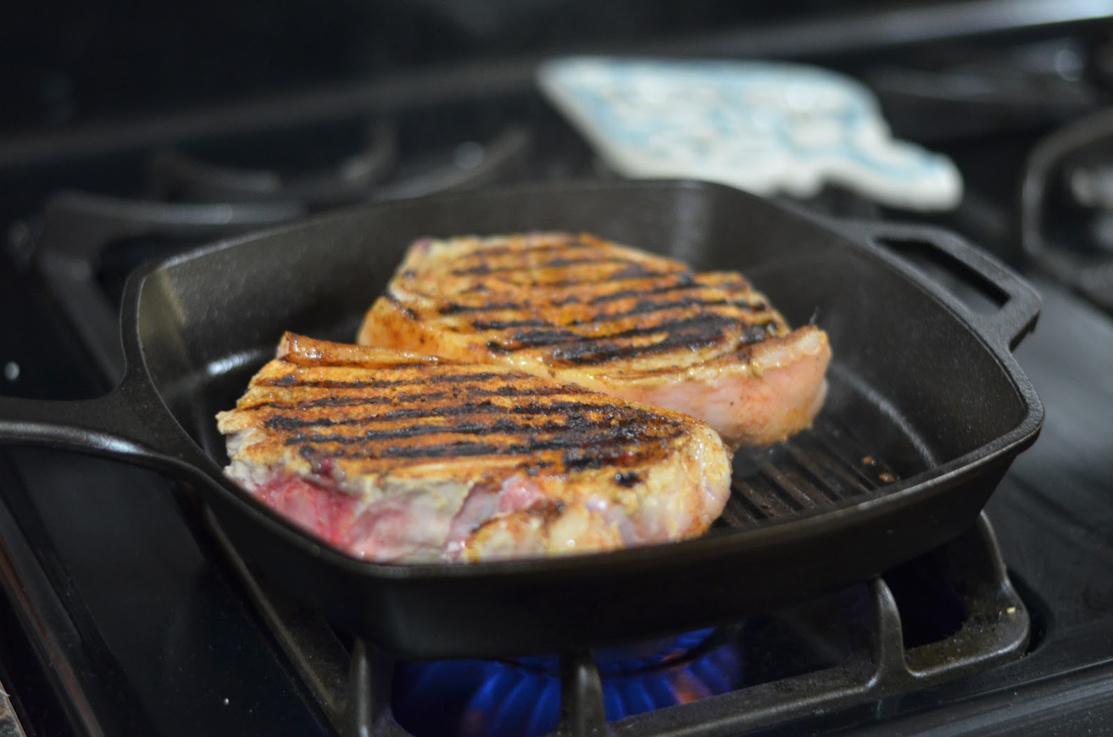 Blend spices together with your handy mortar and pestle (or just stir them together in a bowl with a fork–no need to be fancy!). Rub on both sides of the chops. Let the rub settle in for at least 30 minutes.