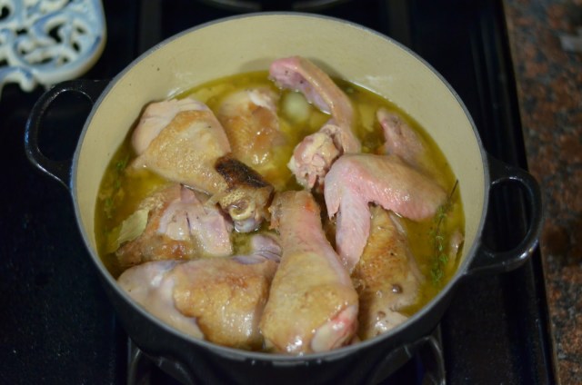 Return chicken to dutch oven and add in broth, lemon juice, tomato paste, garlic, thyme, and bay leaves. Cover and place in oven for 1 hour.