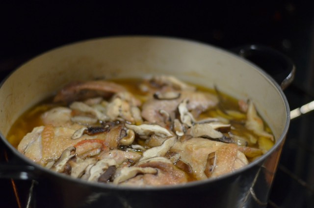 After one hour, open dutch oven and place mushrooms on top of everything. Cover again and return to the oven for another hour.