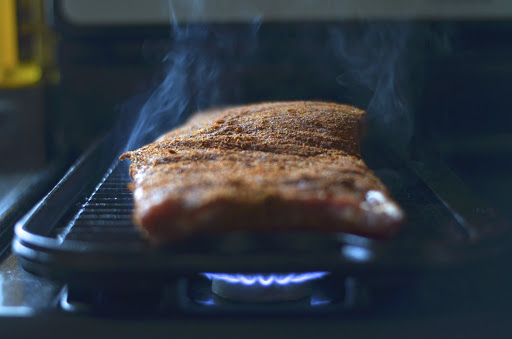 Combine all dry ingredients to make a dry rub for the ribs. Remove any excess fat and the membrane on the ribs. The membrane is the white filmy substance on the underside of your ribs. A dry paper towel will help you get a decent grip on the membrane and rip it off. For the parts of the membrane that will not easily come off, score them with a sharp knife about 1/2″ apart and this will allow flavors to seep through.