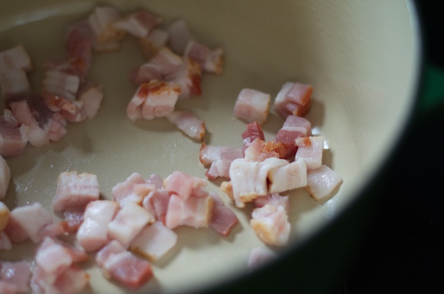 Over medium heat in a dutch oven, sear the bacon for 3-4 minutes over medium heat, until slightly crispy.