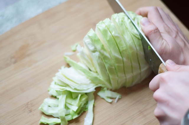 Add cabbage on top, and add salt and pepper to the mixture. We used approximately 1/4 tsp of each.