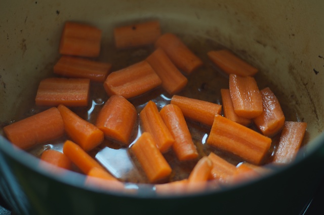 Add carrots to the pot for 1-2 minutes, then place the pork chops on top.