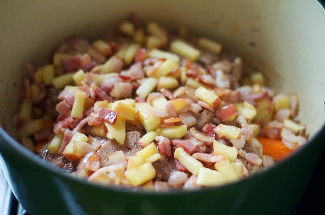 Add apples and continue to heat for another 2-3 minutes. Remove apples and bacon and set aside.