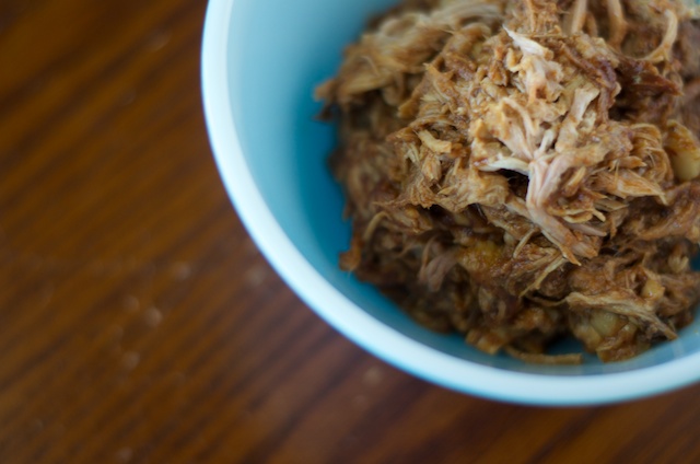 Remove pork from broth, and shred with two forks.  Save the stock for soup or a nice warm drink–it is super gelatinous.