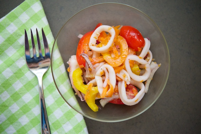 When our local supermarket had organically sourced squid, we couldn’t pass up the opportunity to make a dish that didn’t include frying this delicious cephalopod. This salad is light and refreshing, and would easily work as an appetizer or first course, but can also work as a full meal itself. If you’re looking to put together a more exotic meal without a lot of effort, this is certainly a great way to go. Just note that cleaning and preparing squid can be a little time intensive, so if there is an option to buy them pre-cleaned (and you’re in a hurry), take advantage of it.
