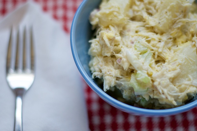 One thing that many people still don’t know about us is that despite our blog name, we live in Maryland. Let me explain—when we started the blog a bit over 3 years ago, we were living in Springfield, Virginia. It was a great little spot, and we liked it a lot, except for the price. When we found the chance to move across the district to upgrade for a house (instead of an apartment), closer to the Metro, and lower rent, we jumped on it. This crab potato salad is just one small celebration of our time in Maryland.