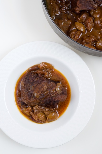 Set short ribs aside to rest on a plate, and sauté onions on medium-low heat for two minutes.