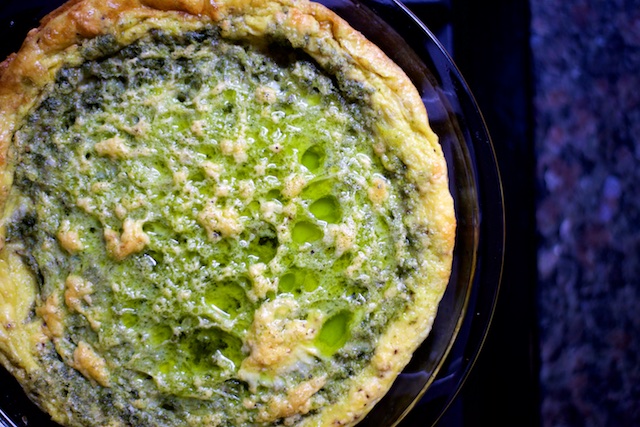 - Spoon in pesto and use a fork to spread evenly around center of pan.