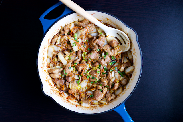 - Melt coconut oil in large skillet over medium heat. Add pork and cook until pink is no longer visible, but not all the way through (6-8 minutes). Remove and season with another pinch of salt.