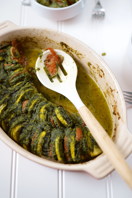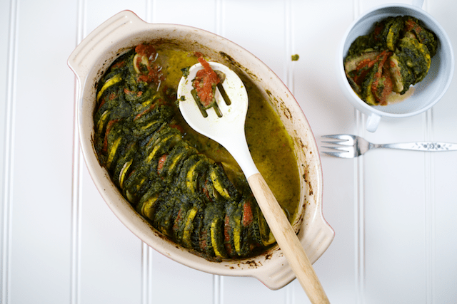 We have had fun experimenting with pesto in the past (you may recall Tomato Pesto SaladChicken Pesto Pasta, and Easy Pesto Egg Bake) and last weekend I was craving vegetables at every turn. I have always wanted us to make a Ratatouille but we have had a lot of tomato-based meals lately; so when Brent suggested we use pesto instead of a tomato sauce, I agreed.