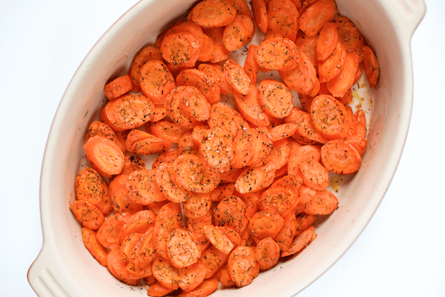 2. Toss carrots, oil, and seasoning in your baking dish. Roast for 40- 45 minutes until tender.
