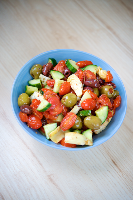 - Combine roasted tomato and olives to a medium bowl with cucumber and artichokes.
