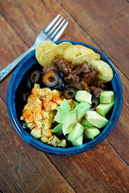 This is kind of a deconstructed breakfast burrito, and the plantain chips gives it the crunch of a taco. If you include dairy in your diet, feel free to also serve this with high-quality cheese and/or sour cream. Sliced jalapeños are great, too!