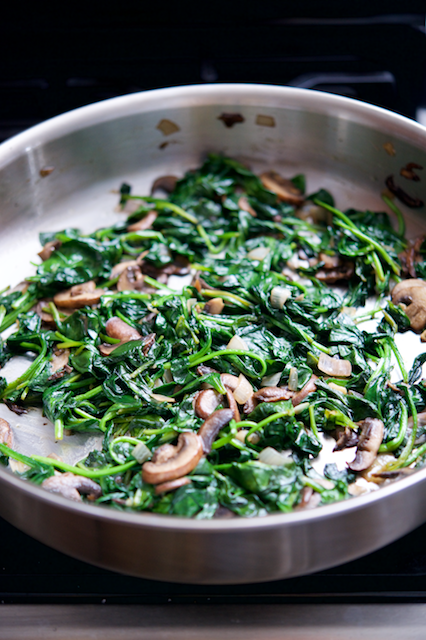 - Melt ghee over medium heat in a large skillet. Add mushrooms and sauté for 3-4 minutes, until soft.