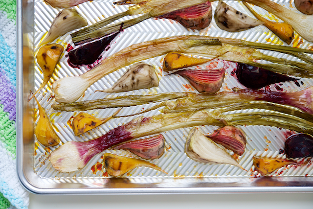 1 bunch small rainbow beets (ideally, 1 white beet, 1 peppermint beet and 1 red beet)
