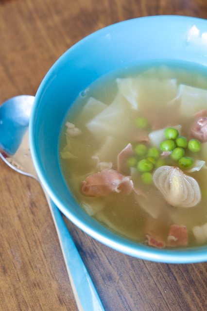 - Add pearl onions, peas, and prosciutto. Simmer 2 minutes.