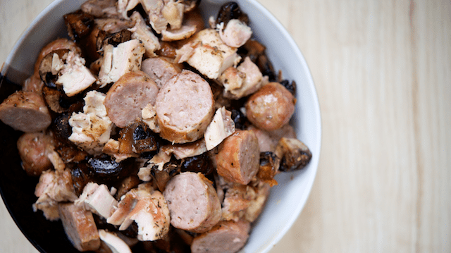 - Chop the sausages and chicken, and toss together with the mushrooms and pan drippings in a serving bowl.
