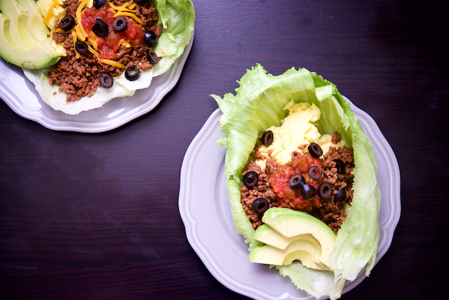 To plate, layer two iceberg lettuce leaves. Spoon into the bed of lettuce some of the scrambled eggs and ground beef mixture. Top with your desired amount of salsa, avocado, black olives, and cheese (if you tolerate dairy).