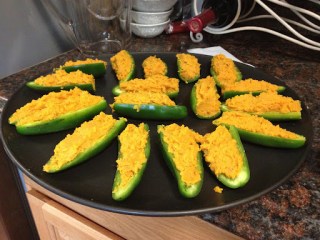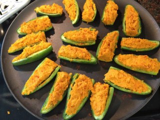 1. Chop bacon into small chunks, peel (and shred) sweet potatoes, and halve and deseed jalapeños.