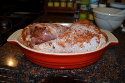 4. Place the whole chicken in your large baking/roasting dish, cover, and allow it to marinate for 2 to 3 hours.