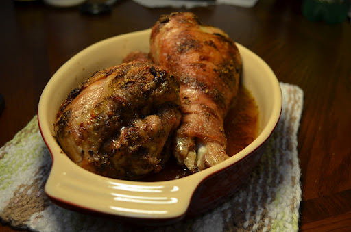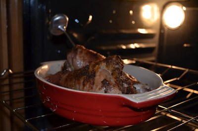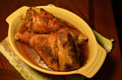 9. Spread the baste over the chicken, cover and cook in the oven for at least 90 minutes, basting every 15 minutes or so with the pan juices, or until the internal temperature of the chicken reaches somewhere between 150 and 155 degrees.