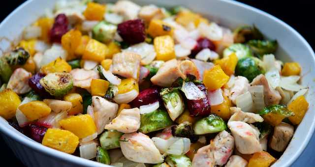 After perusing the fresh produce area, I decided to make a mash-up bake with a rainbow of vegetables along with uncooked chicken breast that we had leftover in the fridge from something else. It not only looks beautiful, it tastes good. The overall flavor is very earthy and savory, but the pumpkin and beets give a light sweetness while thyme adds a slightly bright note. We hope you enjoy it!