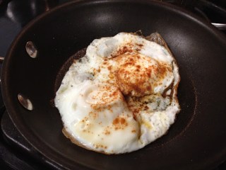 - Melt the ghee in your pan over medium-high, then crack your two eggs into it and fry those babies up! Within the first minute of them cooking, sprinkle some salt, pepper, ancho chili powder and chipotle chili powder over the eggs.