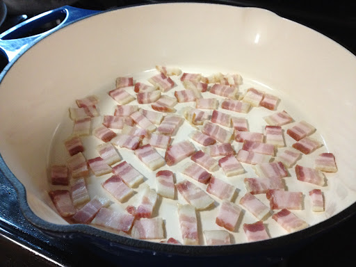 - In a caste iron skillet or dutch-oven-like pan, cook the bacon over medium-high heat until just before it gets crispy (about 3 – 5 minutes). Be sure to flip the pieces around so both sides get cooked.